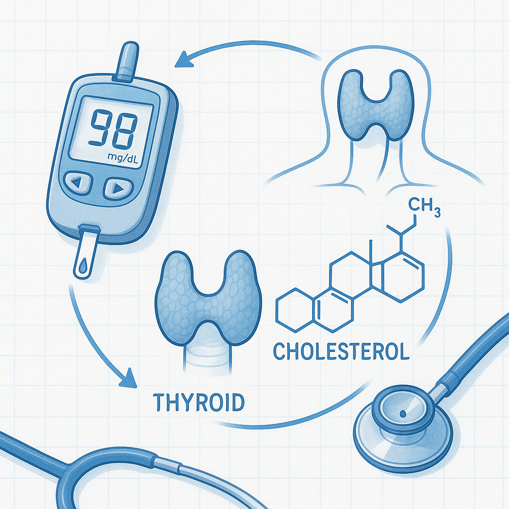 당뇨병, 갑상선 기능 이상, 고지혈증은 각각 다른 질환이지만, 상호 연관되어 있습니다. 예를 들어 갑상선 기능 저하증이 있으면 고지혈증이 악화될 수 있고, 당뇨병과 고지혈증이 함께 있으면 심혈관 질환 위험이 크게 증가합니다.