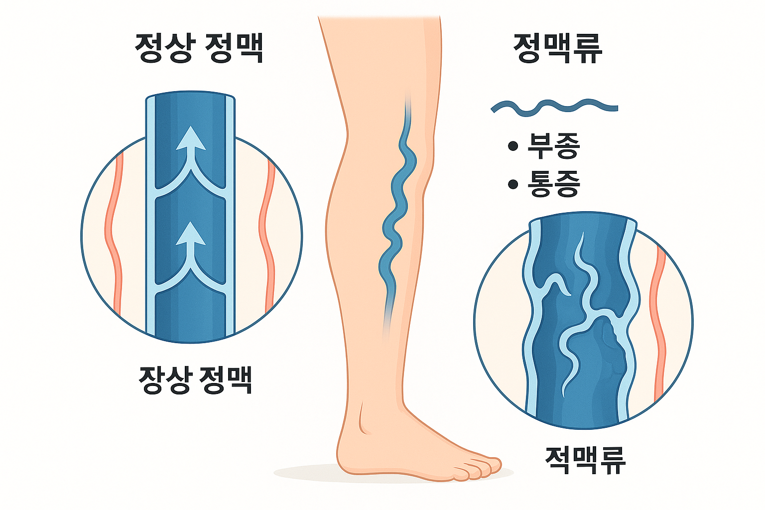 만성하지정맥류(Chronic Venous Insufficiency)는 다리의 정맥 판막 기능이 저하되어 혈액이 심장으로 제대로 돌아가지 못하고 다리에 고이는 질환입니다. 정상적인 정맥에는 혈액의 역류를 막는 판막이 있지만, 이 판막이 손상되면 중력에 의해 혈액이 아래로 흘러 정맥이 늘어나고 부풀어 오르게 됩니다.